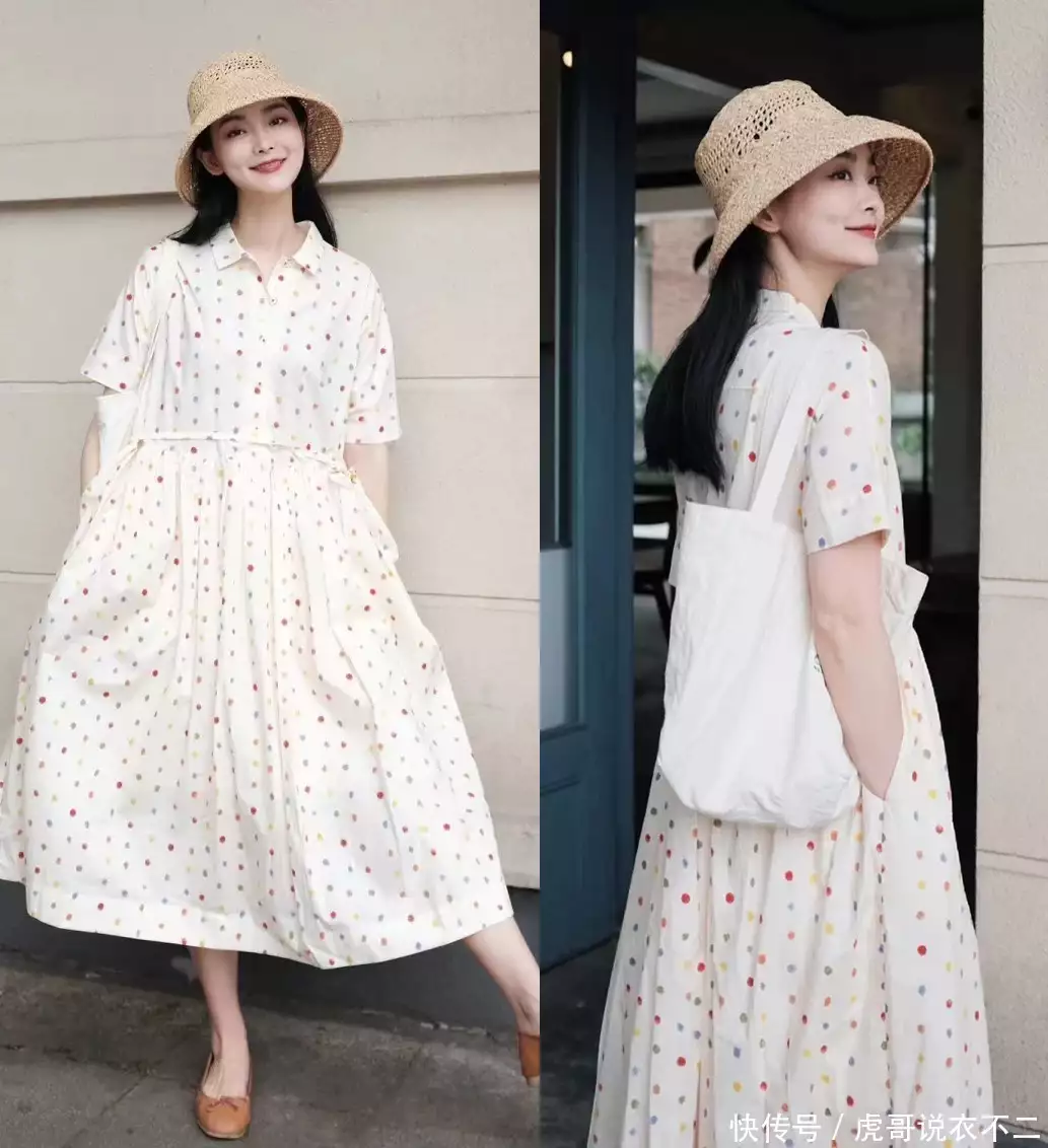 繁多的色调或许会让人产生眼花缭乱的感觉,但如果是图中这种小波点元素,就能避免这一问题,反而借由五颜六色的圆点,使外型看起来较为可爱元气只是整件长裙是较为收紧的斜口,如果不使用腰带勒紧面料的话,就不容易穿出窈窕纤细的身形,同时还可能显矮。