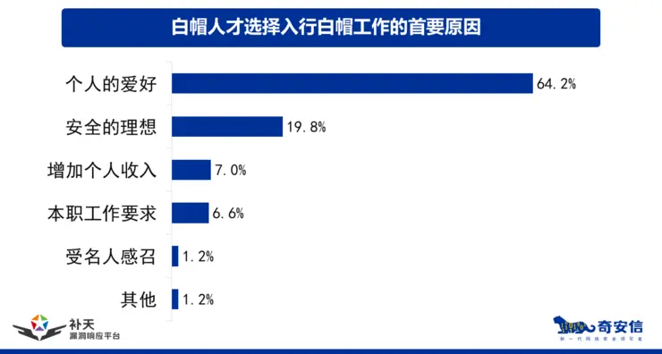 是什么原因驱使自由人子从事树洞、攻守等信息安全工作的呢? 64.2%的受访者表示,“兴趣爱好”是他们从事自由人工作的首要原因此外,抱有“安全的理想”、“增加个人总收入”、“本职工作要求”等因素,也是影响自由人专业人才息影的重要驱动力。