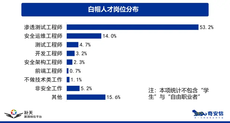 随着恶意软件价值的持续提升,两栖作战攻守军事演习日益受到更高重视,自由人子的酬金总收入也会“水涨船高”,预计未来几年,这一群体的规模仍有望持续、快速增长那么这些自由人子究竟来源于什么岗位呢?考察表明,在只考虑在政企单位就职的自由人子的情况下,有约53.2%的自由人子日常工作岗位是渗透测试工程师,占比最多;14.0%自由人子为安全运维工程师,名列第二;还有4.7%的自由人子为测试工程师,具体分布如下图所示。