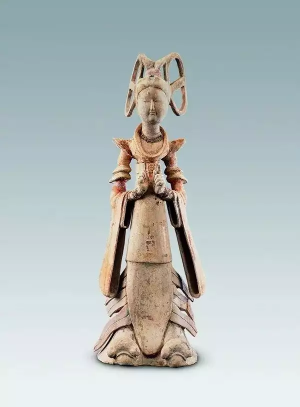 唐彩绘双环望仙髻女舞俑身材颀长,削肩蜂腰,头梳双鬟望仙髻,柳眉凤目,高鼻朱唇,颈戴项链身穿阔袖襦,外罩贡领翘肩半臂,下着曳地长裙,前腰佩绣花蔽膝,臂饰钏镯,双手抬举至胸前,食指伸出,神态虔诚女舞俑头上梳着一种复杂而高峻的发髻,名双环望仙髻,是唐代著名发型,该发髻非常高,超过二尺,梳理该复杂的发髻特别费时,大约需六个小时,如果没有足够的时间,或者自己的头发不够,就事先做好一个假发髻,到需要的时候再戴到头上。