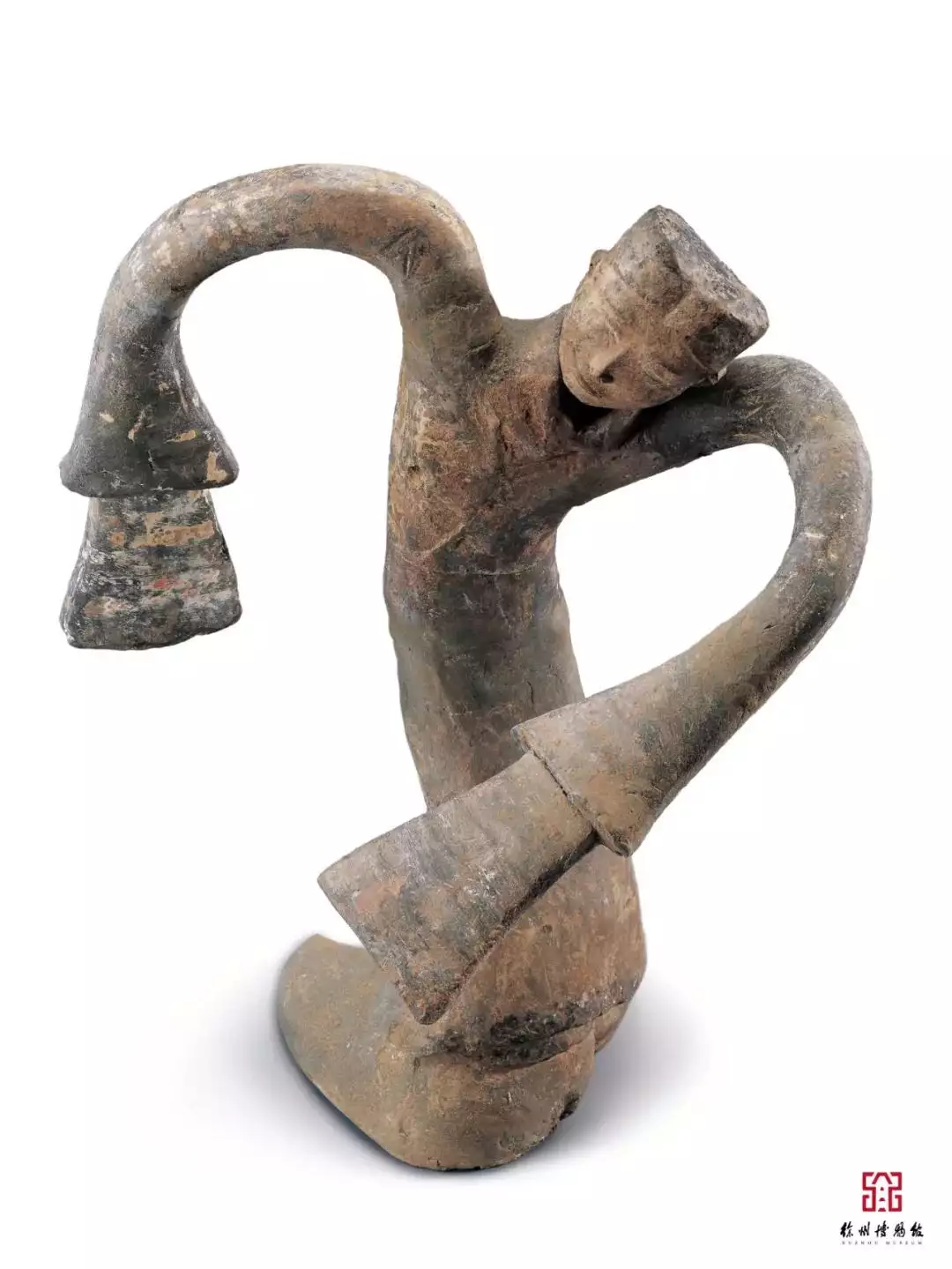 “陶绕襟衣舞俑”身着绕襟深衣,顶发中分,于脑后挽成发髻,眉目清秀,身姿娇柔,身体随着舞步的变化呈现出“S”形双臂上举,左、右上臂前后各刻有一“五”字,长长的衣袖从空中向身后飘下,动感十足从舞俑造型看,跳的应是当时盛行的长袖折腰楚舞。