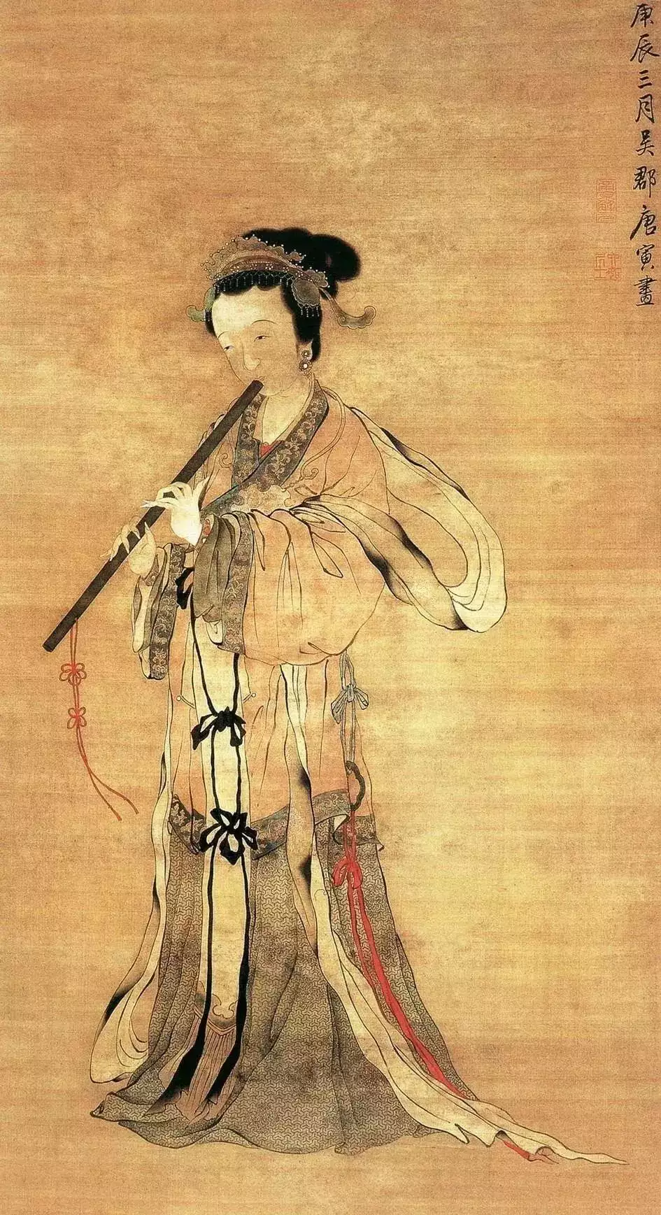 翘角披肩,曳地长裙,再配上高高翘起的履头,唐彩绘双环望仙髻女舞俑只作出一个起势,就已经吸引了一大波人群关注。【乐器肩负】《吹箫肖像画》南京博物院