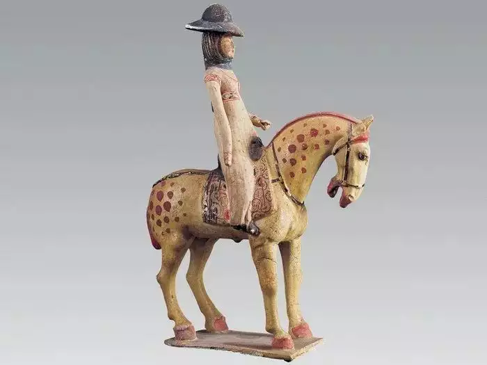 “当季潮品”在这位彩绘釉陶戴帽骑马女俑头上展现得淋漓尽致:头戴紧裹髻发的帷帽,帷帽之上加一顶时髦的笠帽;乳白色上衣外套带花边的黄色半袖,下着淡黄色条纹长裙;足穿尖头鞋,骑在一匹红斑纹黄马上,勒缰前视,神情悠然,扬鞭策马。