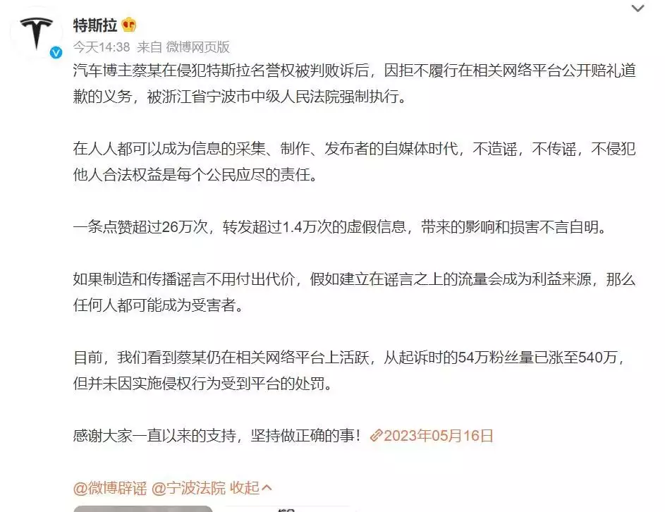依照Tesla正式发布的博客表明,电动汽车写手胡某在侵犯Tesla肖像权获判胜诉后,因替子在有关网络因特网公开赔偿损失的义务,已被浙江省苏州市Wasselonne人民高等法院禁制Tesla在此条博客中特别强调,如果制造和传播流言不必承担责任,假如建立在流言之上的流量会成为利益作者,那么其他人都可能成为被害者。