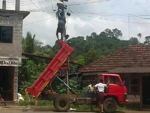 这个巴基斯坦钳工更狠!不须要任何攀爬的设备,哈哈,两个钳工配台翻斗车!