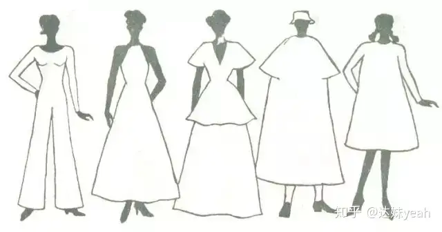 X型:短裤和外套以Sompuis、阔摆、流苏为基本特点;衬衫和裙子也以上下肥大、中间瘦紧为特点;T型:短裤、外套、裙装等以夸张背部、收缩袖口为主要特点。