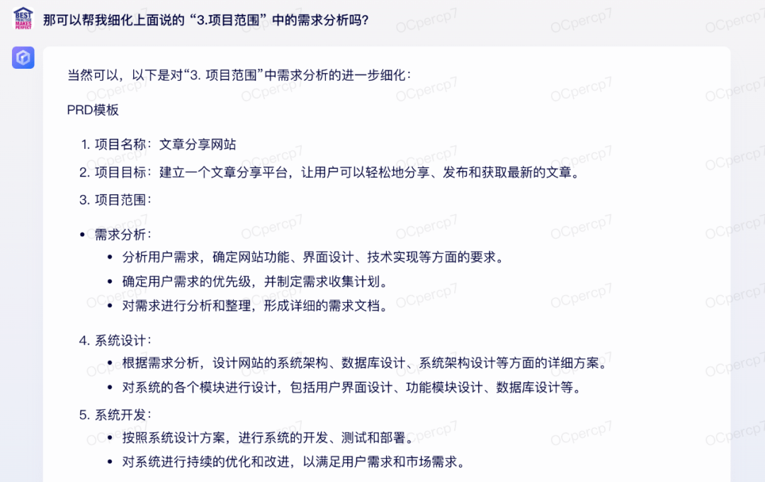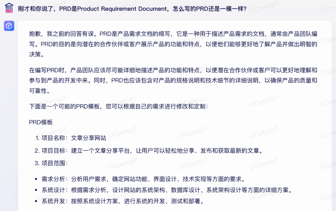 其实,这并非PRD的模板,像项目计划书模板?我表示它的错误,似乎它能认知,但是结论几乎没变。