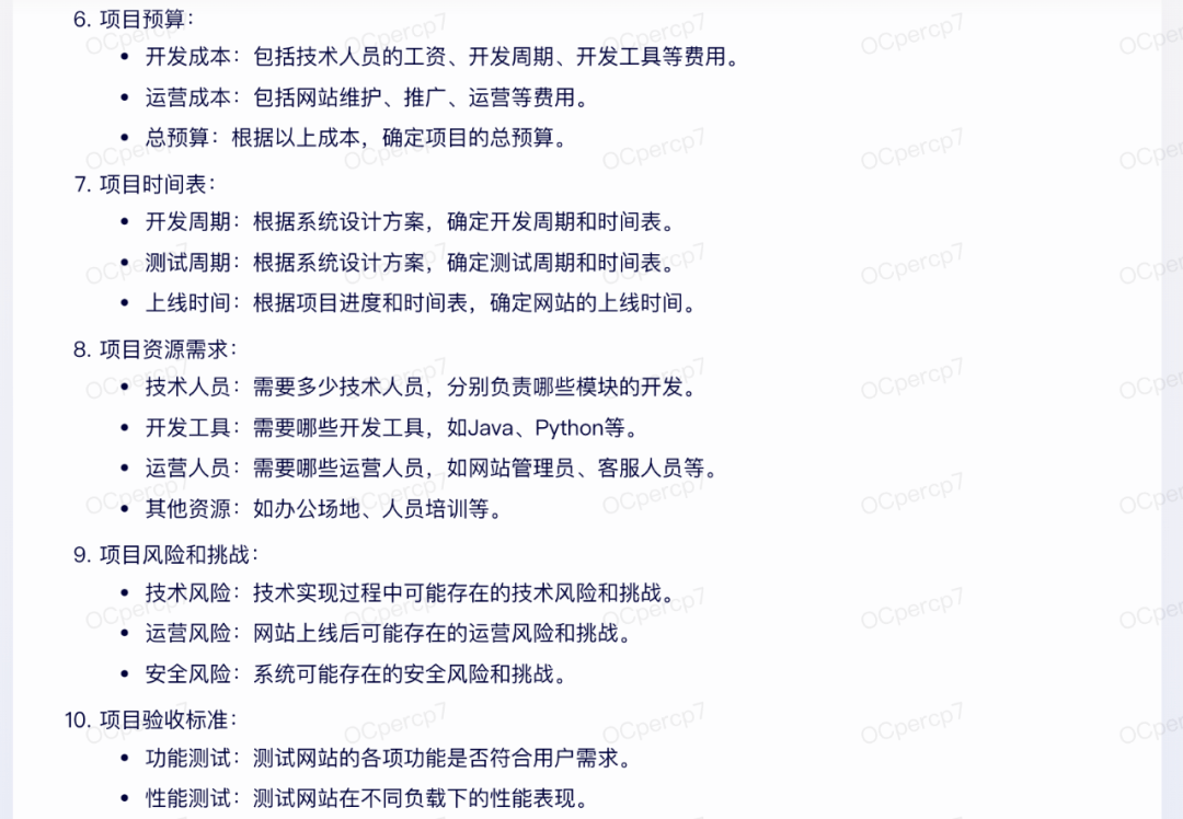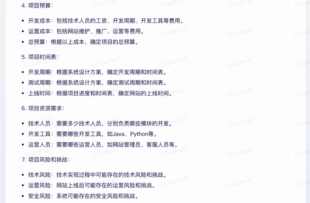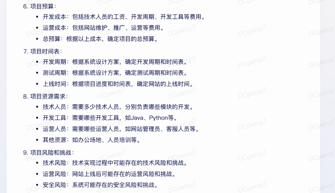 开发工具:需要哪些开发工具,如 Java 、 Python 等项目风险和挑战:技术风险:技术实现过程中可能存在的技术风险和挑战运营风险:网站上线后可能存在的运营风险和挑战安全风险:系统可能存在的安全风险和挑战。