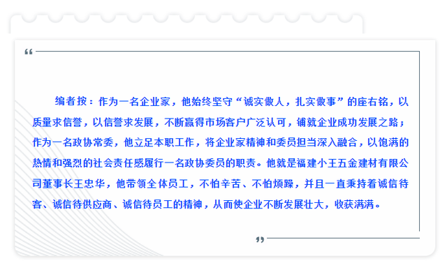 此外,做为一名民企经营者,李彬华讲信用,重信誉,以信立业,自民企成立以来,他就把正直忠义做为民企立身之本,绝不采购不合格的产品,他严格经营管理,严把质量关,为公司树立了较高的信誉度和美誉度 李彬华说:“小张五金在龙溪经营了三十年,我平时也严格要求所有的员工对客户一定要坦诚相待,决不能做缺斤少两的生意。