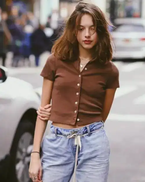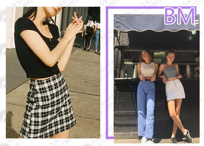 艺术鲜明特征:短、紧、露,柔和贴身的棉或纺纱织物、高腰设计、颜色明亮或鲜艳、少年感领带~