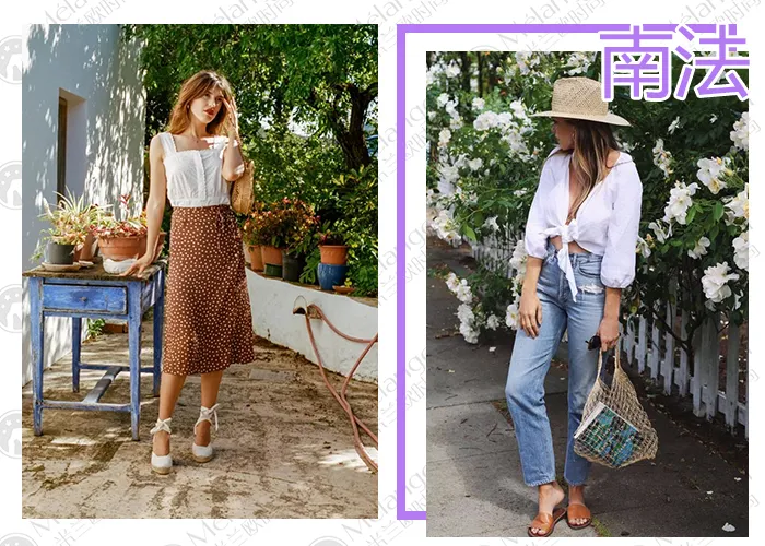 *南法风表现在色调温柔娴静、服装线条柔美或者利落干净,带有惬意的度假气息。