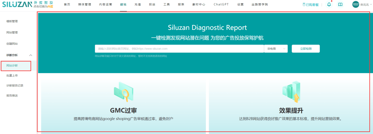 在这一环节里,我们可以利用网站自动诊断工具辅助诊断谷歌广告开户的风险——丝路赞的网站诊断工具SDR