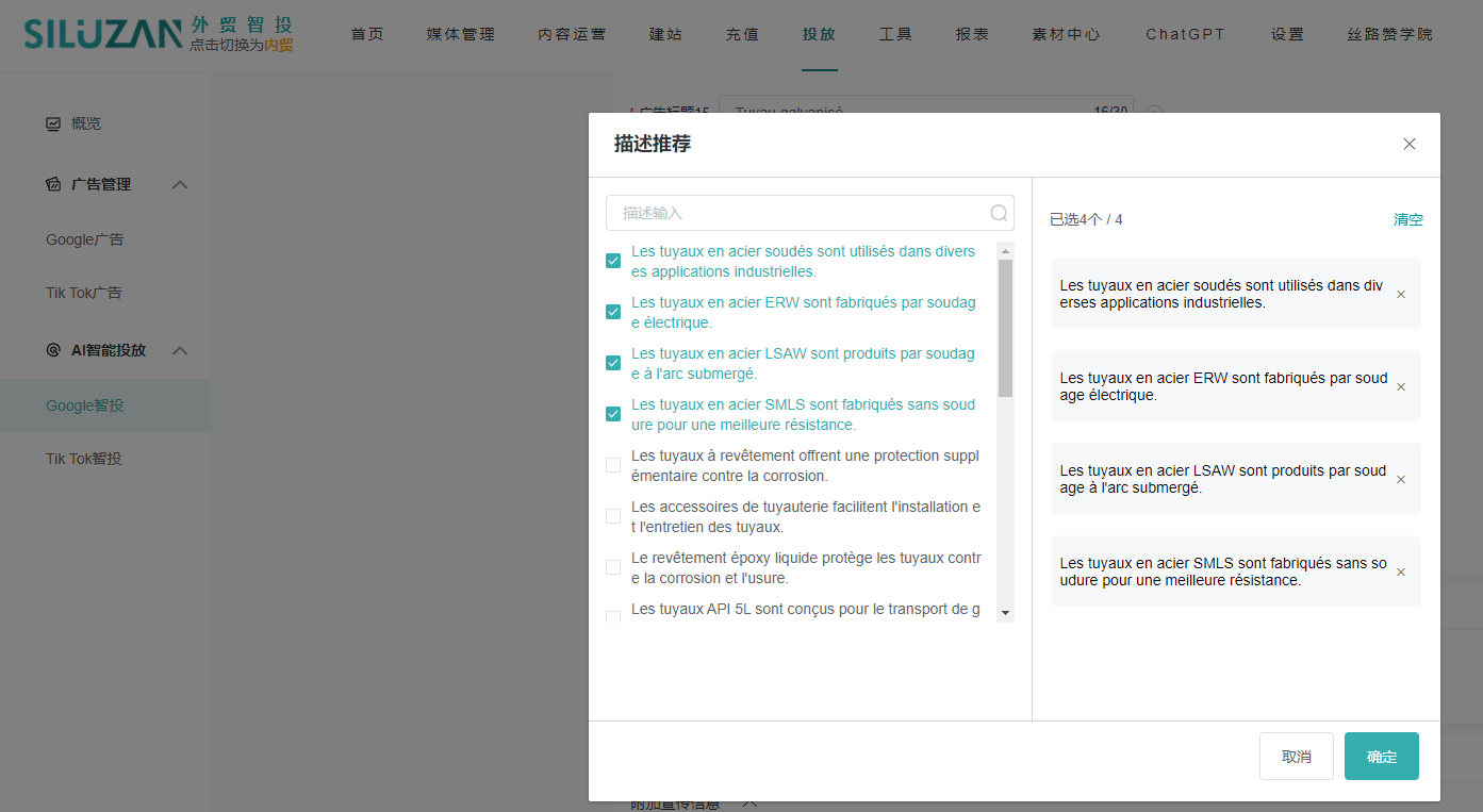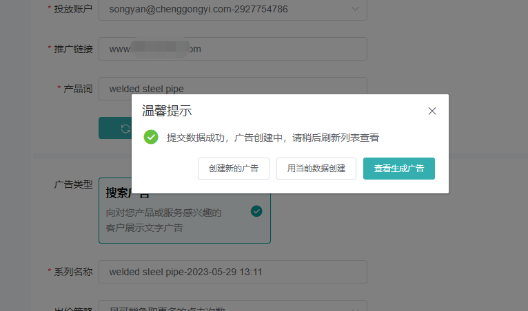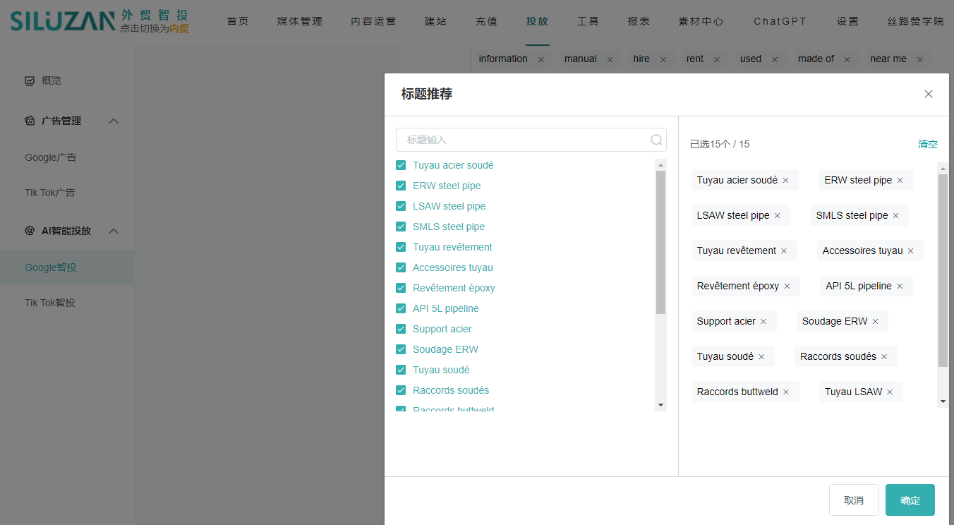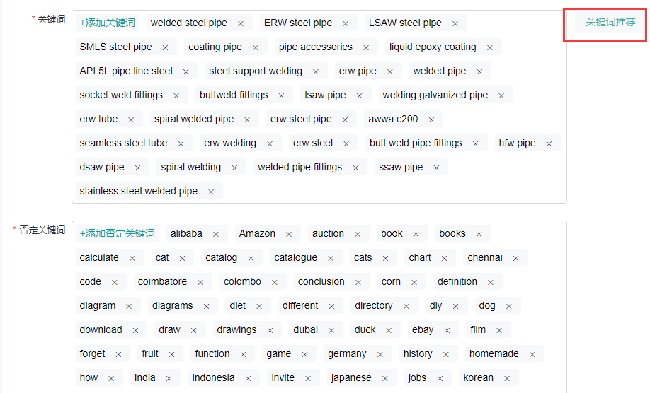 也就是说,丝路赞的智能投放系统是完全参照谷歌黄金账户标准来打造的下列一组截图就是以welded steel pipe为主推产品词为一家钢管企业生成的智能投放方案