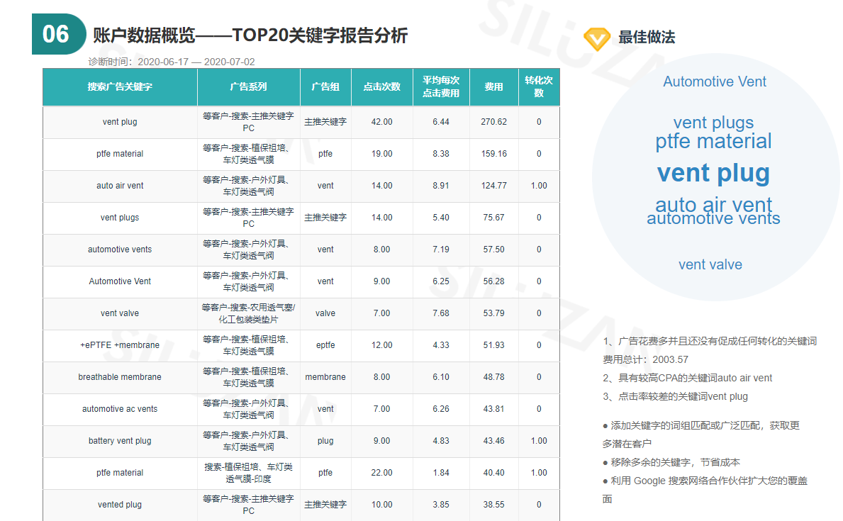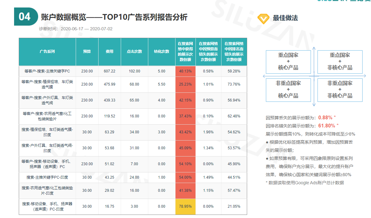 那么如何评估广告效果,并进行针对性、有实效的优化调整?当广告效果不好时我们会抱怨钱花出去了见不到效果,但具体是哪个环节影响了最终的结果? 丝路赞广告诊断报告是专门为了提升谷歌广告效果数据量身打造的自动化报告工具,就像我们熟知的体检报告一样,广告账户也需要经常做“体检”,以了解广告账户处于何种状态。