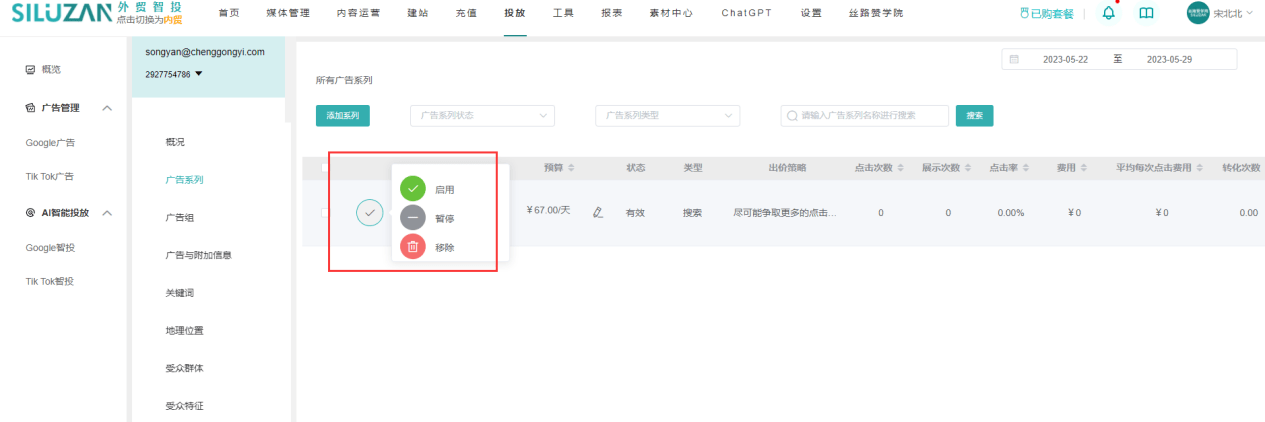 丝路赞Google智投账户广告系列示例当以上信息都确认可用后,保存提交创建就可以保存到谷歌广告账户中了,开启“启用”后即可开始投放2 广告诊断报告谷歌广告投放的效果好坏最终会体现在企业收到询盘的数量和质量上。