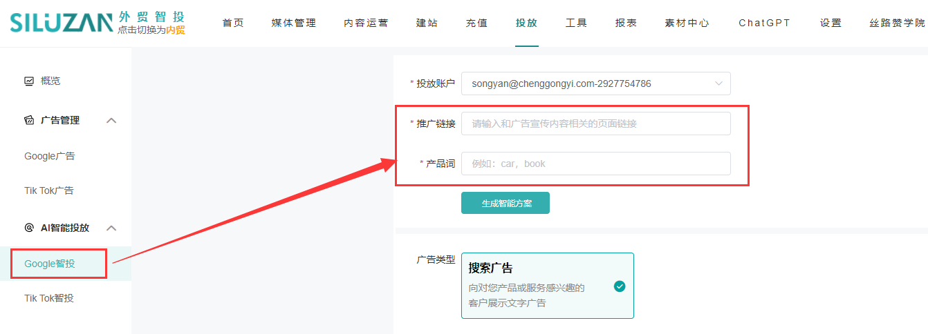 如何解决这点问题?丝路赞的智能投放(简称AI智能投放),以Google智投为例,只需要推广链接和主推产品词就可以一键生成智能投放方案。这对不懂谷歌广告投放的小白来说堪比“福利”。