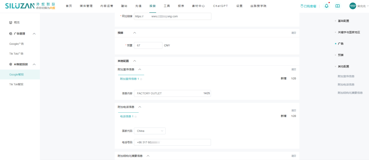智能广告预算&附加宣传信息&附加电话信息推荐示例