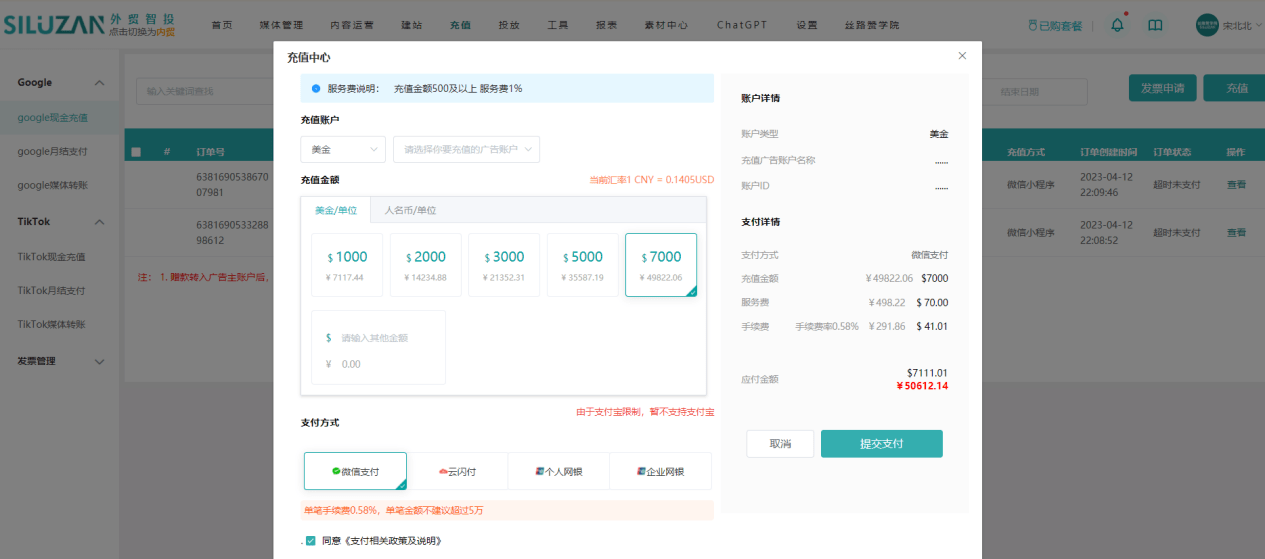 这就意味着作为出海企业每次充值时都需要承担6%税点的问题前文提到因为政策调整很多服务商“无暇接待”小额充值的企业,这对于占据相当大比例的中小企业来说无疑又增加了一道门槛丝路赞的广告充值功能,免“翻墙”是基础,充值金额不受限制,支付方式支持微信支付、云闪付、个人网银、企业网银任选,还有重要的跨币种充值。
