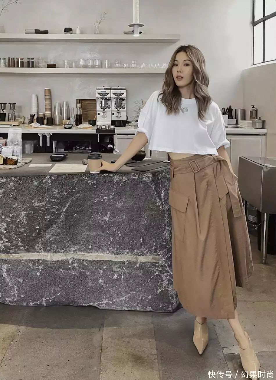 A字伞裙的遮肉效果,更是肉眼可见地强悍。唯一需要注意的就是身高问题。高个子的上恩能尽情地尝试各种长度的衬衫。而娇小的上恩,则尽量避免衬衫长度超过膝盖。并且此类衬衫的适穿范围吗很广。