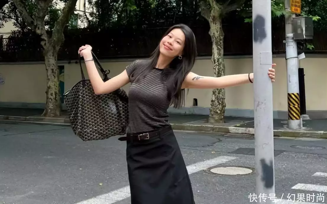 像大甜甜这样的A字裙,下摆微阔,不变得胯宽。与此同时,下装用黑色,更使得整体更加地偏瘦。双重加持下,整个人不瘦都难!不过,更能遮肉的还在后面。