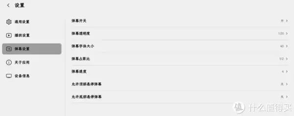 在设置里面可以调整主题色,播映解码设置以及弹幕设置之类,我们要使用的话,所推荐先把弹幕的透明度减少和弹幕占屏比调整成1/4,这样在TV的观感会好一点儿。