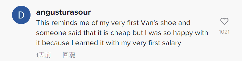 相片源自@zohtaco Tiktok帐号,著作权属原作音频在互联网上迅速引起了反响,越来越多的网民对Zoe表达了他们的支持:这让我想起了我的第一双 Vans 鞋,有人说它很便宜,但我很高兴,即使我用我的第一份薪水赚来的。
