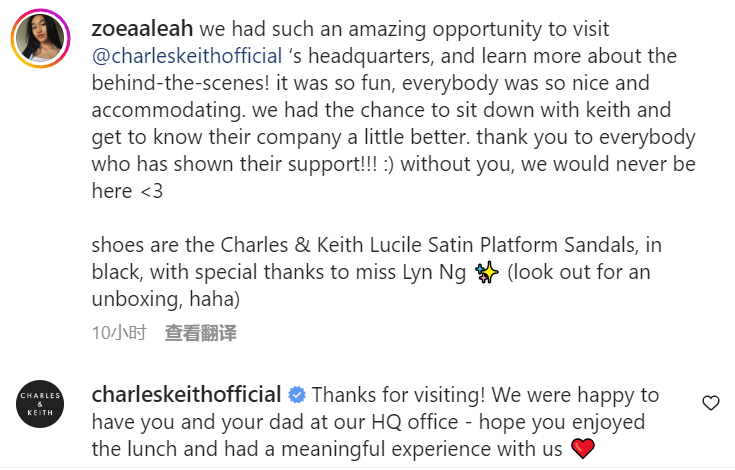 相片源自ins@zoeaaleah,著作权属于原作原来Charles & Keith的创始人Charles Wong 和 Keith Wong 兄弟在得知了Zoe的经历后,爽快地邀请Zoe和她的妈妈来Charles & Keith总部参观,并与父女俩共进午餐。