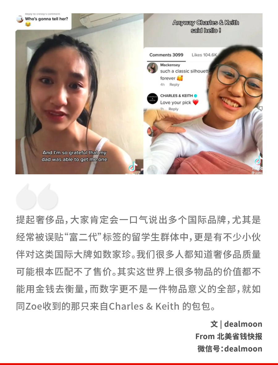 小ck主营女性手袋、鞋履、珠宝等,以其前卫设计和独特创新在年轻人中十分受欢迎,有不输奢侈品手袋的款式,价格也十分亲民据悉,Charles & Keith还慷慨的赠赠送给Zoe了新款手袋和公司的代金券,其他品牌也纷纷跟进,当地拉面连锁店 Takagi Ramen 为她的双亲提供了 80 美元的餐券,当地美发沙龙 Kimistry Hair Boutique 也免费给Zoe 打造了个新发型。