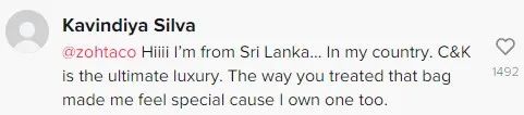 相片源自@zohtaco Tiktok帐号,著作权属原作Hiiii 我源自斯里兰卡……在我的国家,C&K 是终极奢侈品。你对待那个手袋珍惜的样子让我觉得很特别,即使我也有一个。
