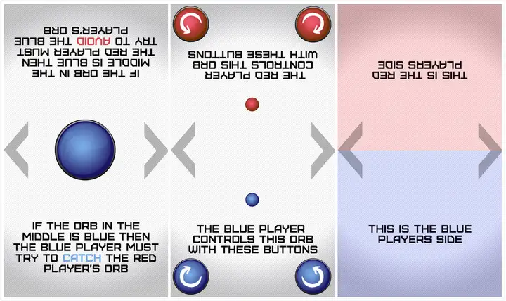 这款格斗游戏玩法很有特色,玩者双方各掌控红、蓝两色,能绕着两个大球转圈的小球,当大球是红色时,红色就能追蓝色然后把它吃掉得一分,每五秒种大球的颜色单厢变一次,所以在追别人的同时也要注意时间格斗游戏前期节奏比较慢,随着时间的推进小球的速度会越来越快,格斗游戏也会越来越刺激(追上你就把你嘿嘿嘿)。