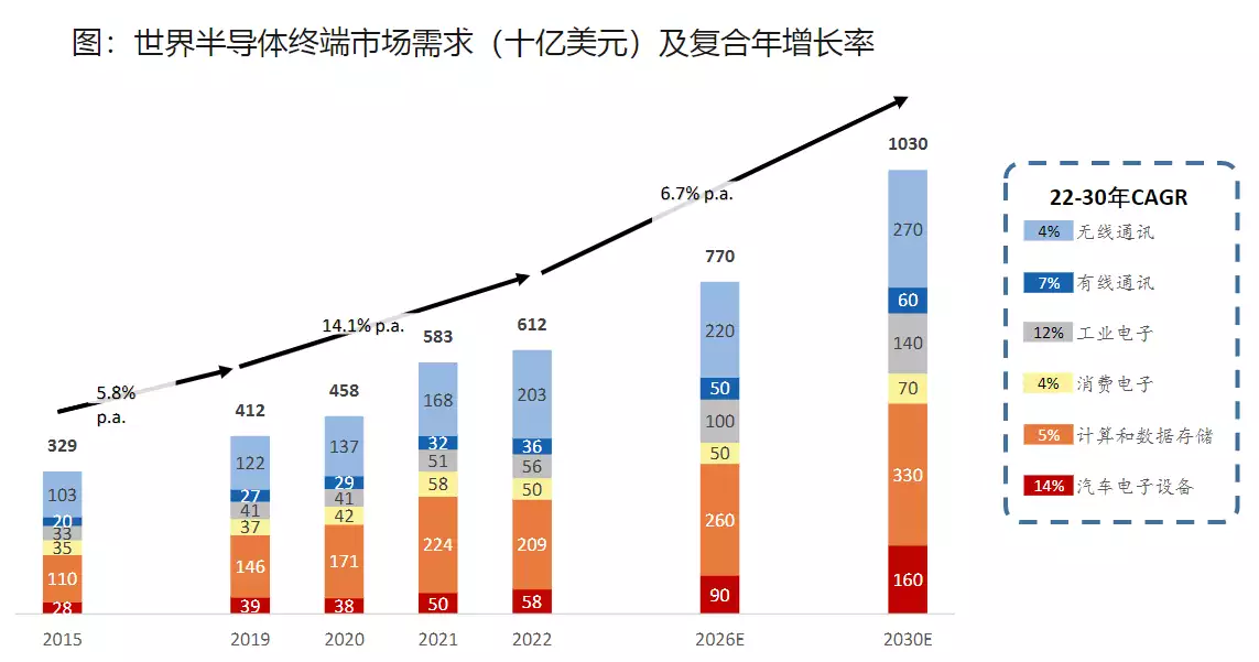 根据麦肯锡预测,2022-2030年,全球积体电路行业年复合增长率达6.7%,2030年市场规模达10300亿美元。