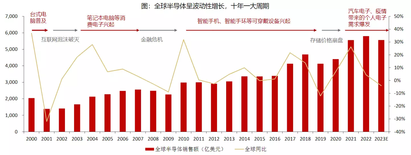 ,过去十年复合增长率7.4%。2023年上半年全球积体电路处于下行周期,但AIGC带来的新一轮控制技术创新引发需求大幅提升,行业可望在2024年迎来上行周期。
