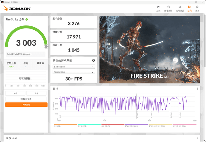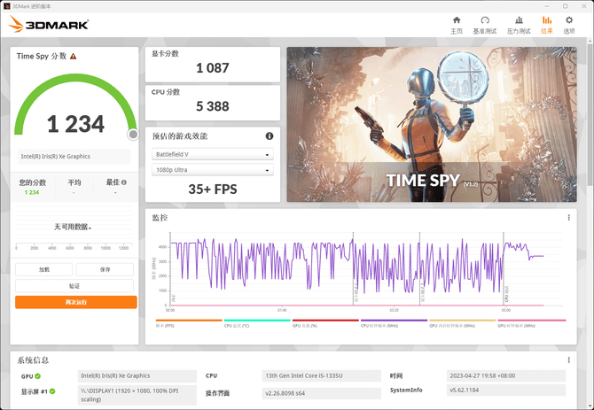 显卡方面,锐炬 Xe 核心显卡,1.25GHz 频率,80EU 图形单元理论测试,Time Spy 显卡的分 1087 分,Fire Strike 显卡得分 3276 分,性能媲美入门级独立显卡,足以应对日常办公设备、学习,甚至是图形、视频的处理和编辑。
