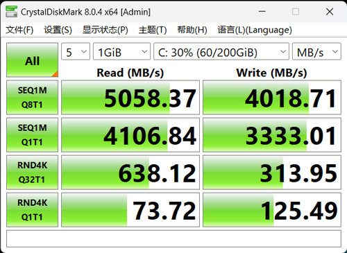 实测来看,它在 CrystalDiskMark 测试中的读写数据,读取速度为 5058MB/s,写入速度 4018MB/s,性能处于主流水平,应对办公设备绰绰有余。