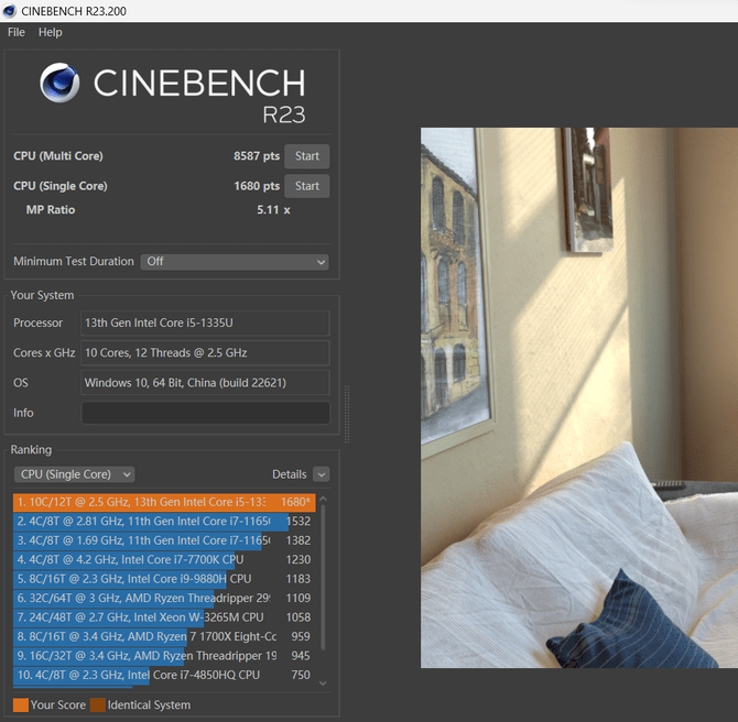 具体的性能表现,我们通过比较常用的测试软件来验证一下 从 CINEBENCH R23 的测试来看,其多核心得分为 8587pts,单核心得分为 1680pts4.60GHz 的 P-core 睿频频率,不仅能够轻松处理各种办公设备应用,也能应对一些轻度的结构设计渲染组织工作,当然,想要更加流畅的性能表现,也能选择更高配置的长平 X5 系列产品笔记型笔记本电脑。