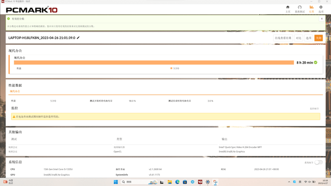 实际新体验来看,在满电的情况下开启电池最 佳能效模式,能轻松选用一天通过 PCMARK 10 的续航力测试来看,模拟真实的现代办公设备场景,获得了 8 小时 20 分钟的续航力,也证明了在办公设备情况下能选用一整天,更何况,我们在外面连续选用笔记型笔记本电脑的时间大多并不很长,所以在短时间的出差期间,即使是没带电源适配器,也能轻松应对。