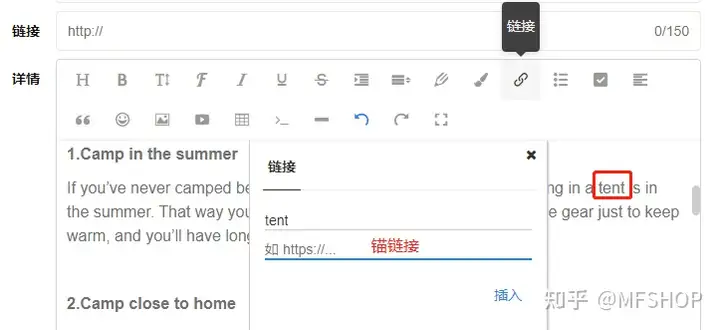 在MFSHOP建站后台文章管理—去添加—详情,选择锚文本,添加锚链接即可。