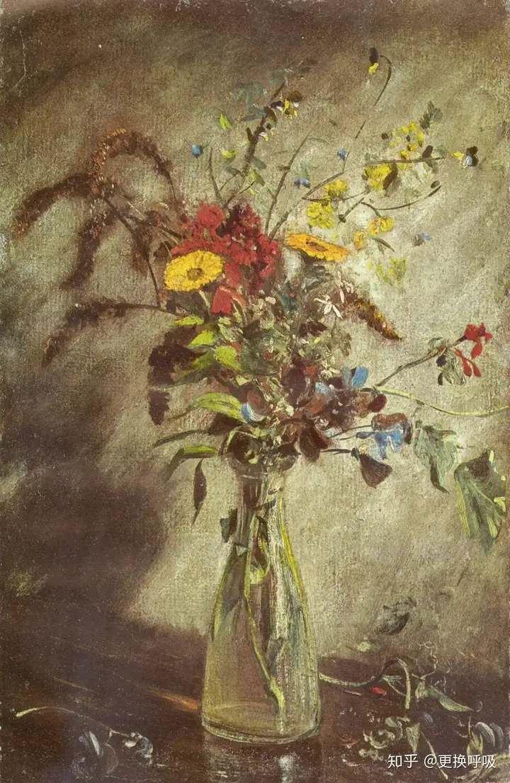 Kara: Yes。Constable的花束肯定不是一束理想的、源自伊甸园的圣物。它就是普普通通的花束。它的存在被画家捕获,并挪移到了画布中。它诚然是在环境中的,但周遭的环境的目的不为别的,只为了衬映它的存在。就好像他们匆匆地瞥了一眼某个角落,立马被角落中的明艳吸引住。
