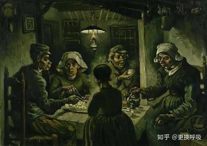 梵谷:Potato eaters - 1885Kara: 不是。嗯。是。简单一点说吧,去巴黎以后的梵谷(1886年以后),勉强能算上一个现实主义画家。但离开了巴黎之后(1888年之后),现实主义离他已经十万八千里了,这时候,他骨子里的理想主义只能通过纯粹的颜色才能完成。