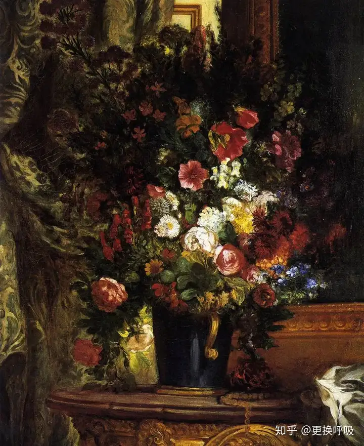 其次,德拉克罗瓦更加富有变化的笔触也让盆景具有了更多的个性,他绘出的并不是理想的花束,而是某一束。这意味着……