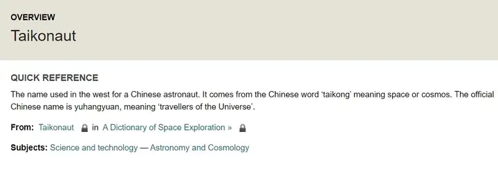 剑桥参照中是这样说明的:The name used in the west for a Chinese astronaut. It comes from the Chinese word ‘taikong’ meaning space or cosmos. The official Chinese name is yuhangyuan, meaning ‘travellers of the Universe’.