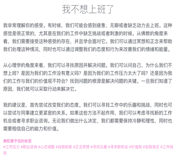 禅了,但ChatGPT这个“佛”能释疑的问题许多,大到“生命的意义”,小到“我不想上班了”,不管你带着怎样的焦虑来,它单厢以一种神人的语气耐心为你修持和寺院里默默注视人间困苦的佛不同,GPT化佛先肯定你的疑惑并表示理解,再告诉你化佛如何看待这件事。