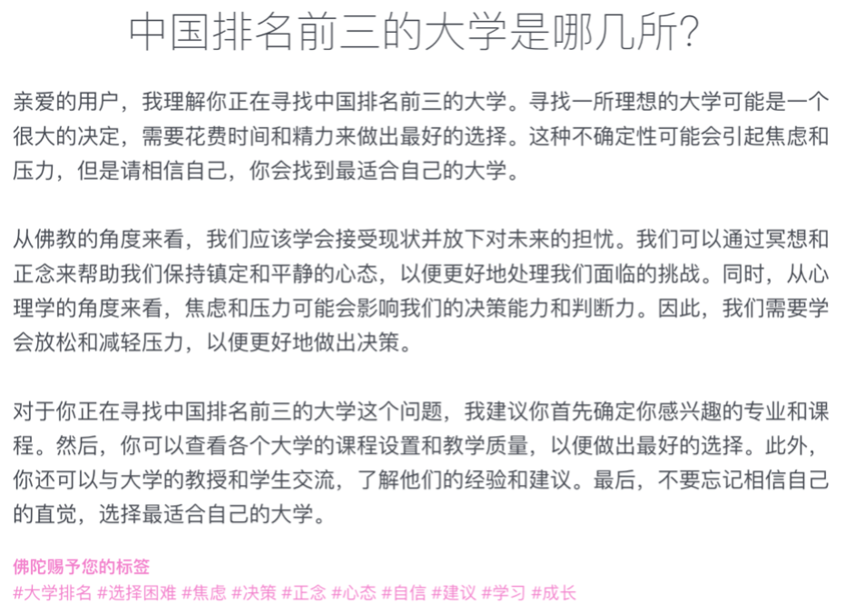 除能给网民解决困惑,GPT佛还是个G4FA大师。当被问及中国排名前三的大学是哪三所时,GPT佛教育我,不要再比了啦,再比就不佛了~!