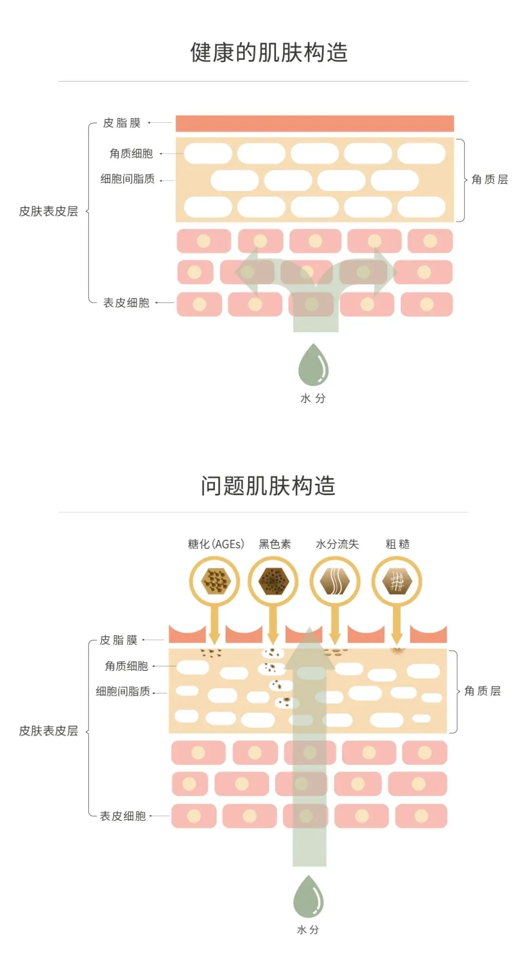 不健康的毛孔屏障,令毛孔对外无法抵御外界环境的刺激,对内无法留住水分养分,活力自然下降。后续即使用了一些含有抗老成分的产品,也会因为屏障不健康导致吸收不进去,护理效果不理想。
