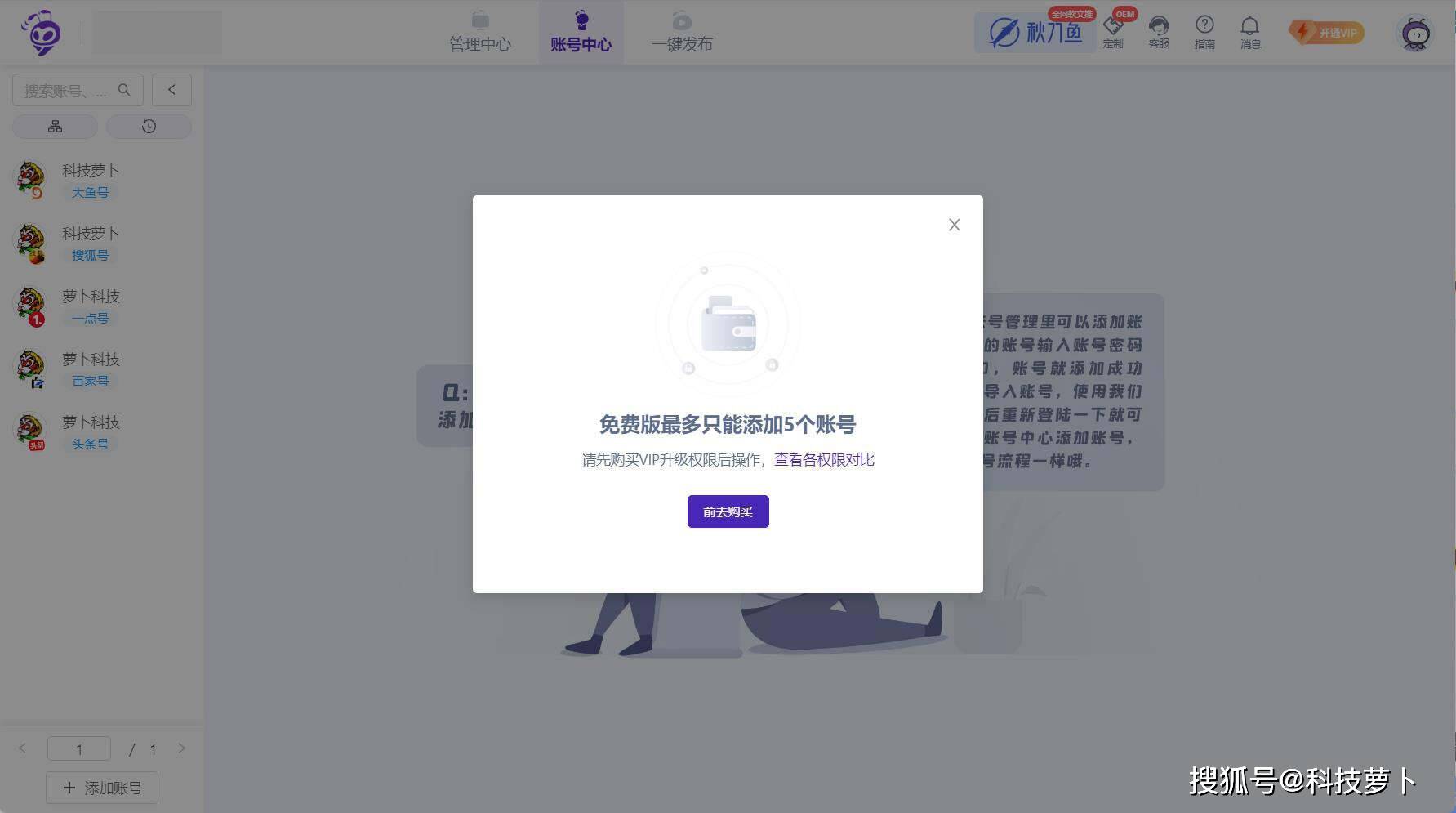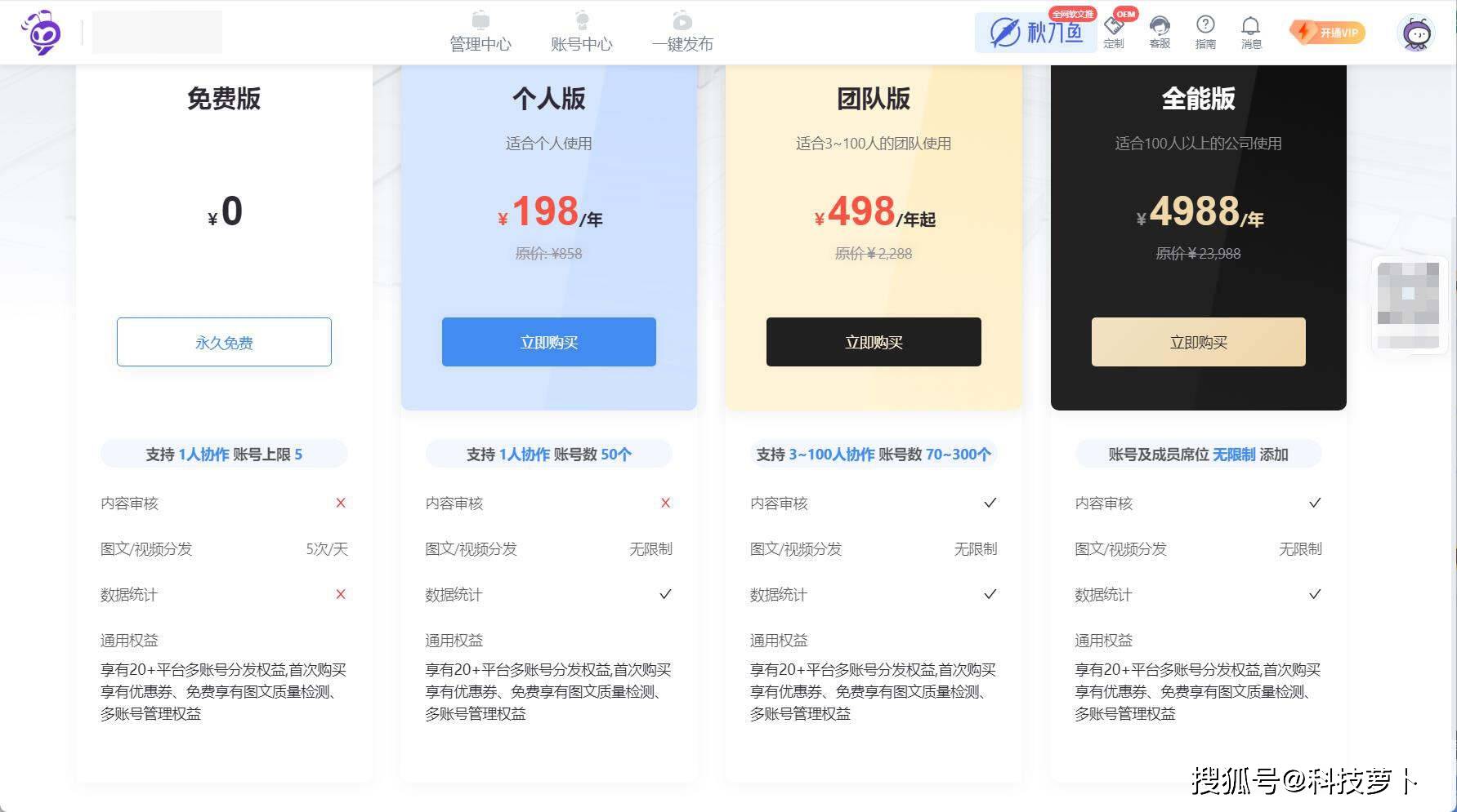 须要说明的是,免费版只能加进5个帐号,对网络平台多的创作者来说,这5个网络平台远远不够,此时能购买VIP升级多网络平台递送,现在个人版一年仅需198元,团队版489元,全能版4988元,我们能根据自身情况选择购买,对大多数个人使用者来说,购买个人版就行,团队能选择团队版。