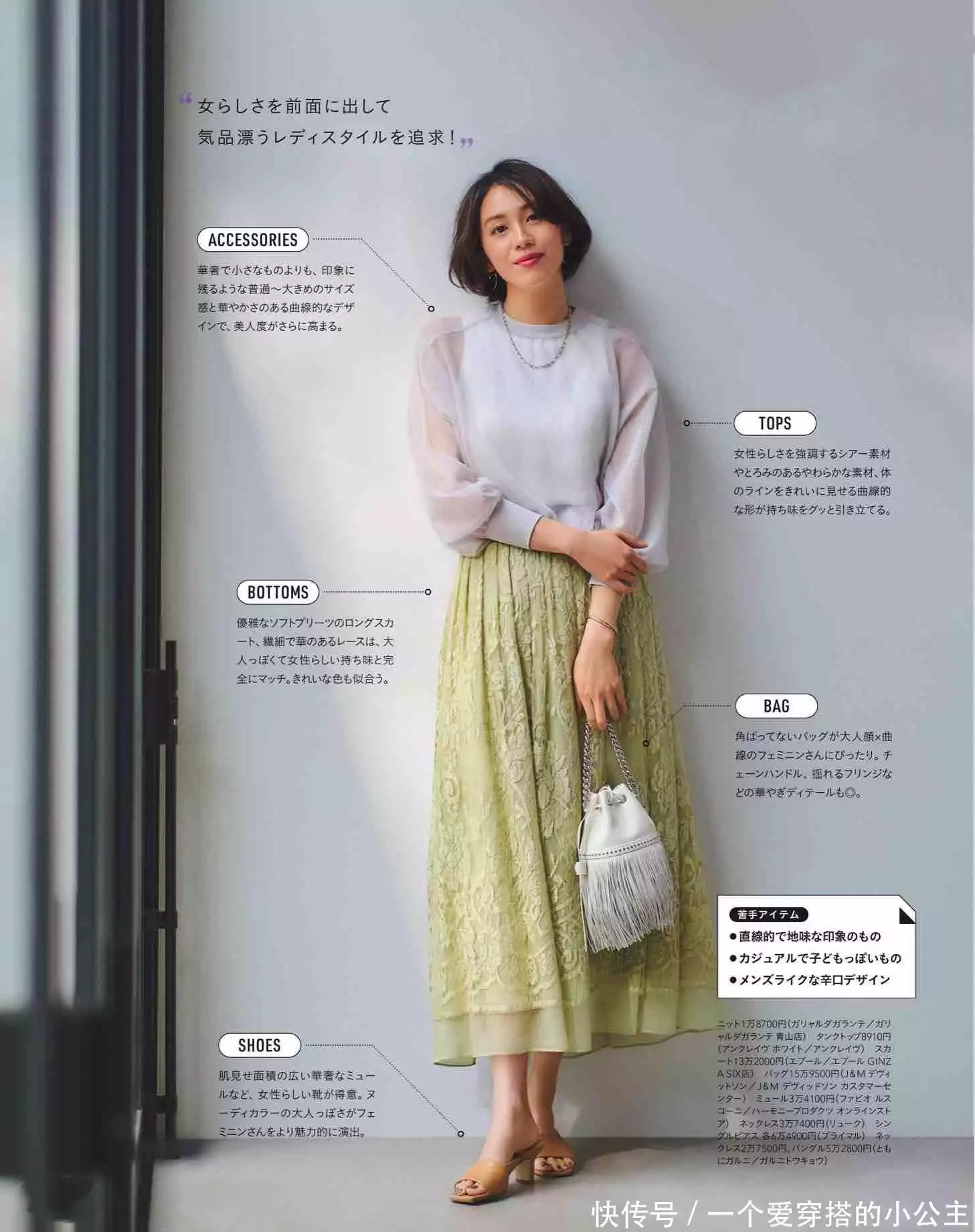 ▎怎样穿因为长了一张自带成熟魅力的「大人脸」,所以过于温吞的极简风穿搭就无法凸显出女性魅力,男人味相貌更适宜华丽典雅艺术风格的着装在轻纱透视衬衫和黄色蕾丝半裙的衬托下,穿著者妩媚温婉、淑女清雅的魅力被展现得淋漓尽致,成熟美人氛围感被拉到了满分。