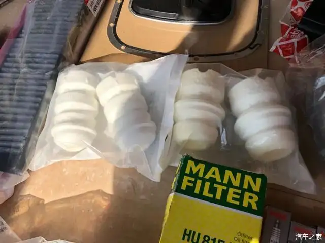 除了顶胶以外,更换避震还需要搭配防尘套和缓冲胶,它们能有效的延缓避震器的寿命。防尘套是原厂的,没啥说的。这是装在奥迪袋子里的模样:
