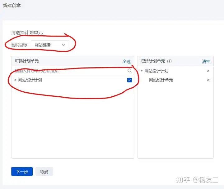 营销目标选择缺省“中文网站链接”要是。之后勾选方案,点选“下一步”按键,就进入到了“创意结构设计”网页。