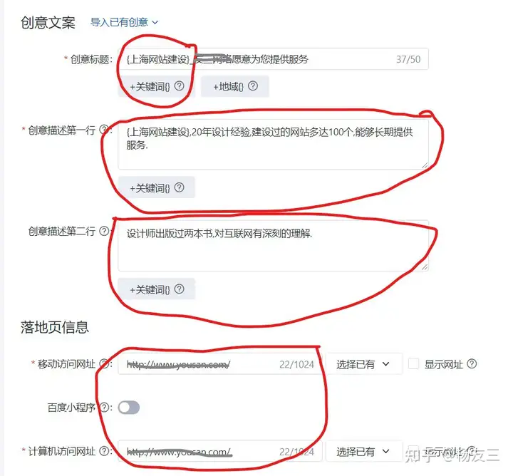 假如在某个地域性推展(不在全国推展),能在“创意结构设计标题”中直接在{ }里把地域性标识出来。反正我加进的每个关键字都带地域性。到真正推展的时候,当客户(子公司推展地域性的客户,比如上海)搜不带地域性的关键字时,比如“中文网站建设”,腾讯也会把子公司的广告展现出来。