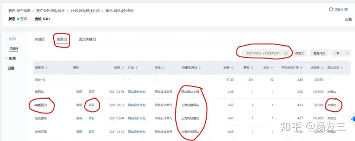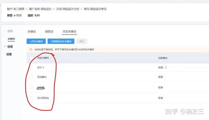 当然,腾讯的人工智能还是会有漏洞。比如,有的“搜寻词”完全不在子公司的销售业务范围内,这时你就要将它加进到“否定关键字”中,只要点选“添否”按键要是。